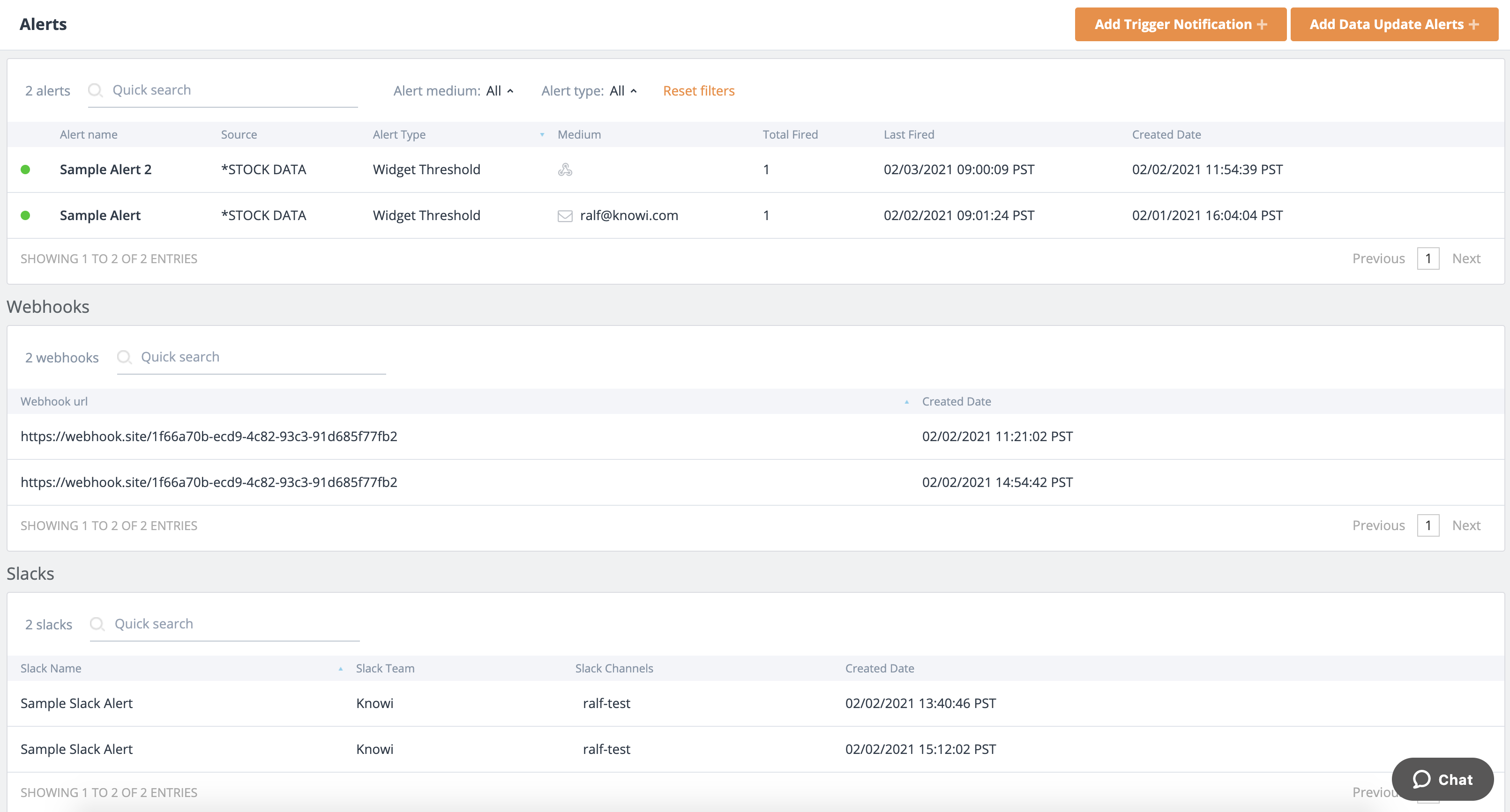 You can create new alerts in Alerts Management by clicking the Add Trigger Notification + or Add Data Update Alerts + orange icons. Note that Widget Alerts must be created on the widget themselves.