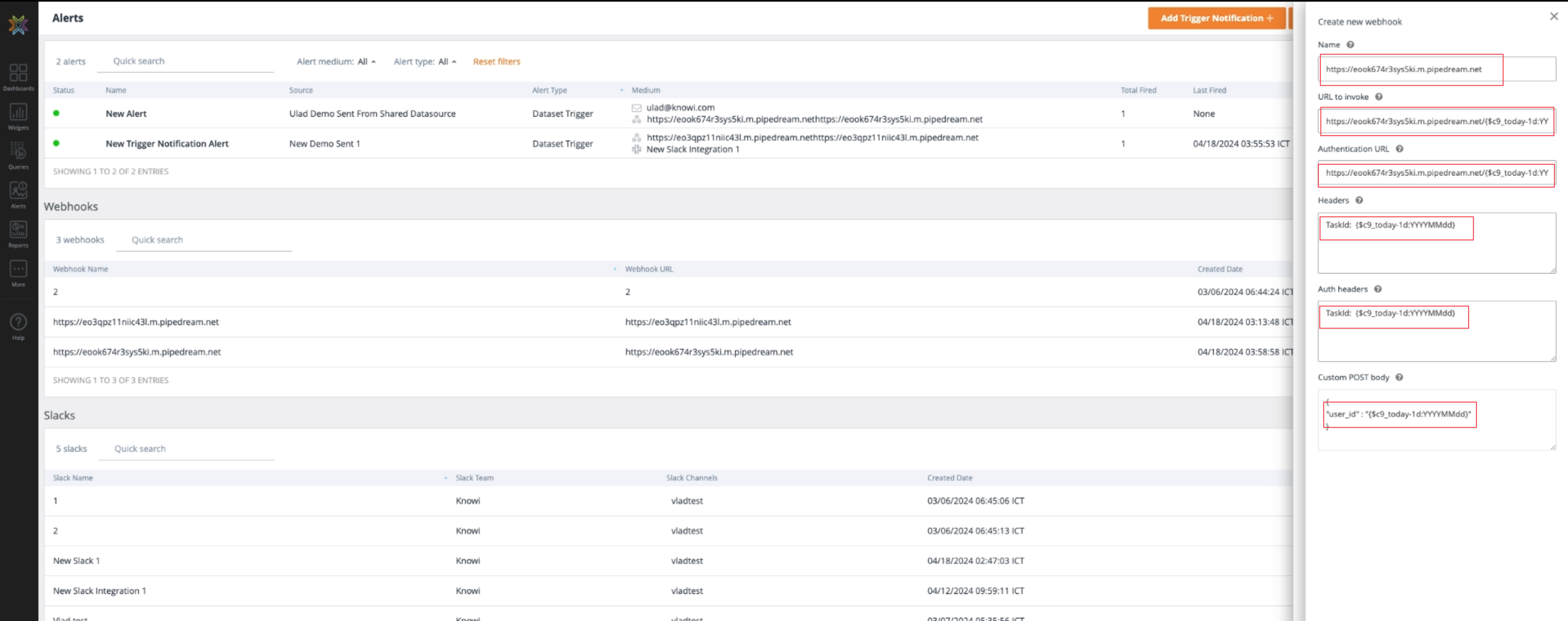 In Alerts Management, you also see a list of all the Webhook and Slack alerts you've created. You can edit each entry by clicking the pencil icon on the right hand side of each line. You can also delete an entry by clicking the Delete icon.