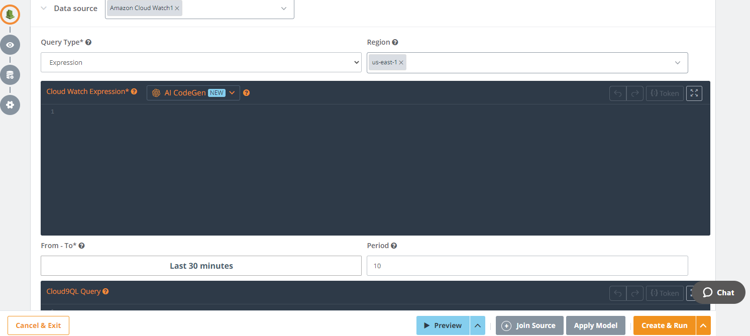 Expression allows users to use CloudWatch search expression. Define the Region, Time Range, and write CloudWatch expression using the Query Editor.