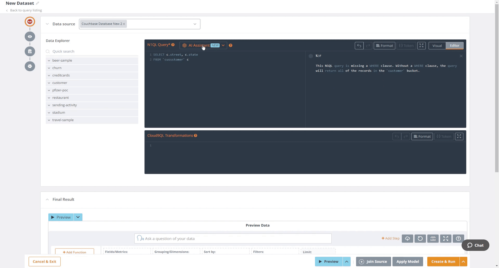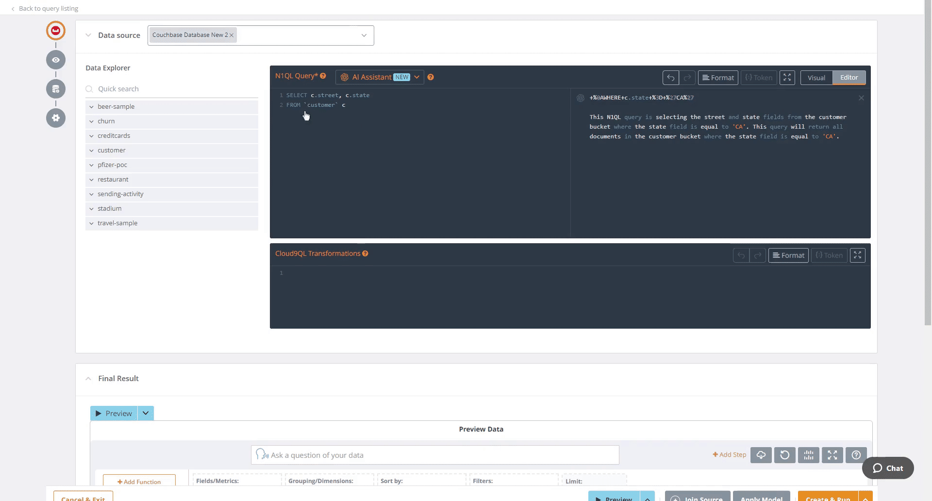 A versatile text editor designed for editing code that comes with a number of language modes including Couchbase Query Language (CQL) and add-ons like Cloud9QL, and AI Assistant which empowers you with powerful transformations and analysis capabilities like prediction modeling and cohort analysis if you need it.