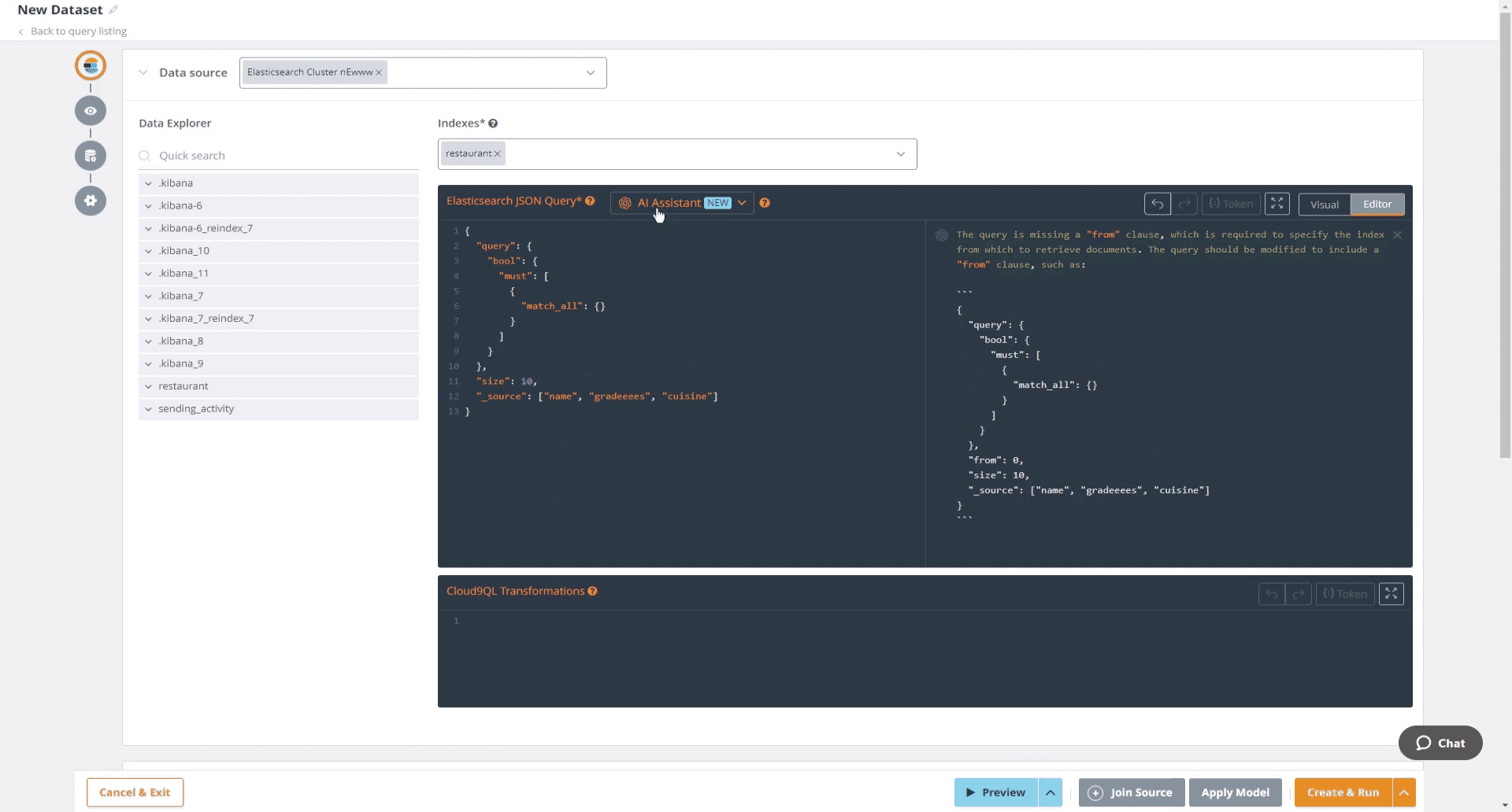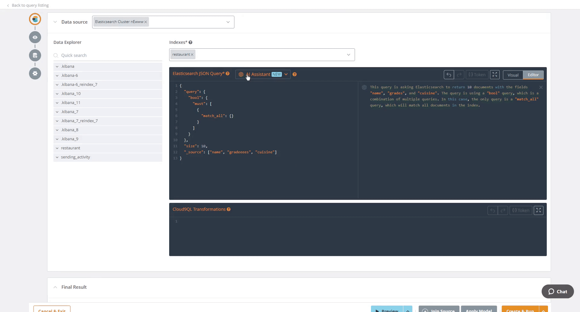 In the Cloud9QL Transformations section, you can define how the auto-generated C9QL query should be placed by setting: