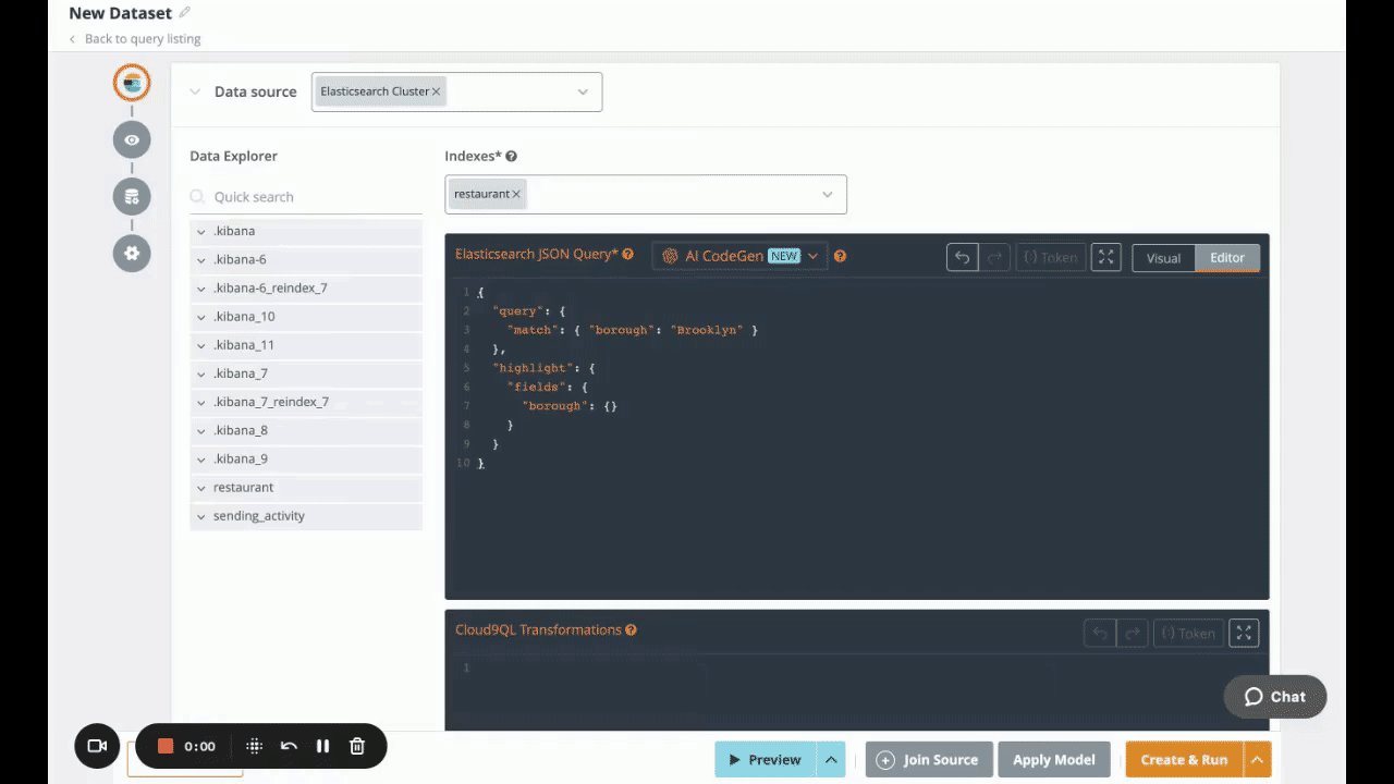 Tip: You can also write queries directly in the Query Editor, a versatile text editor that offers more advanced editing functionalities like ElasticSearch JSON Query, support for multiple language modes, Cloud9QL, and more.
