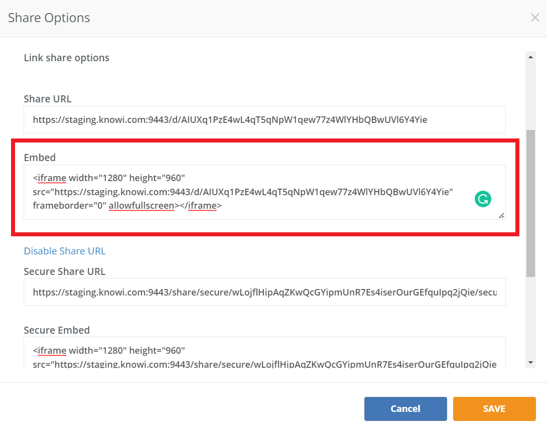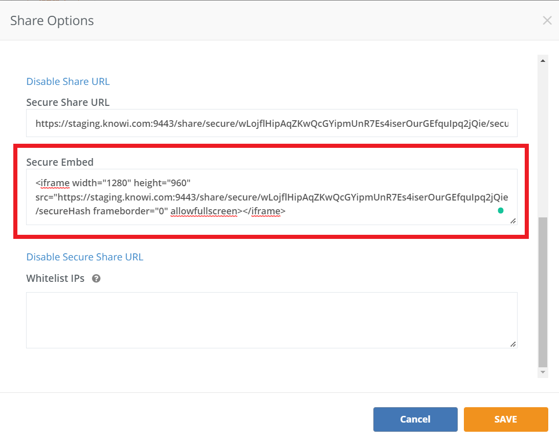 Knowi allows you to embed the Presentation mode for a specific dashboard. This includes embedding with SSO, share URL, iframe, Knowi JS library, i.e. all kinds of embedding. To embed the presenter, you need to enable the "presenterOptions" field in the View Object Reference.