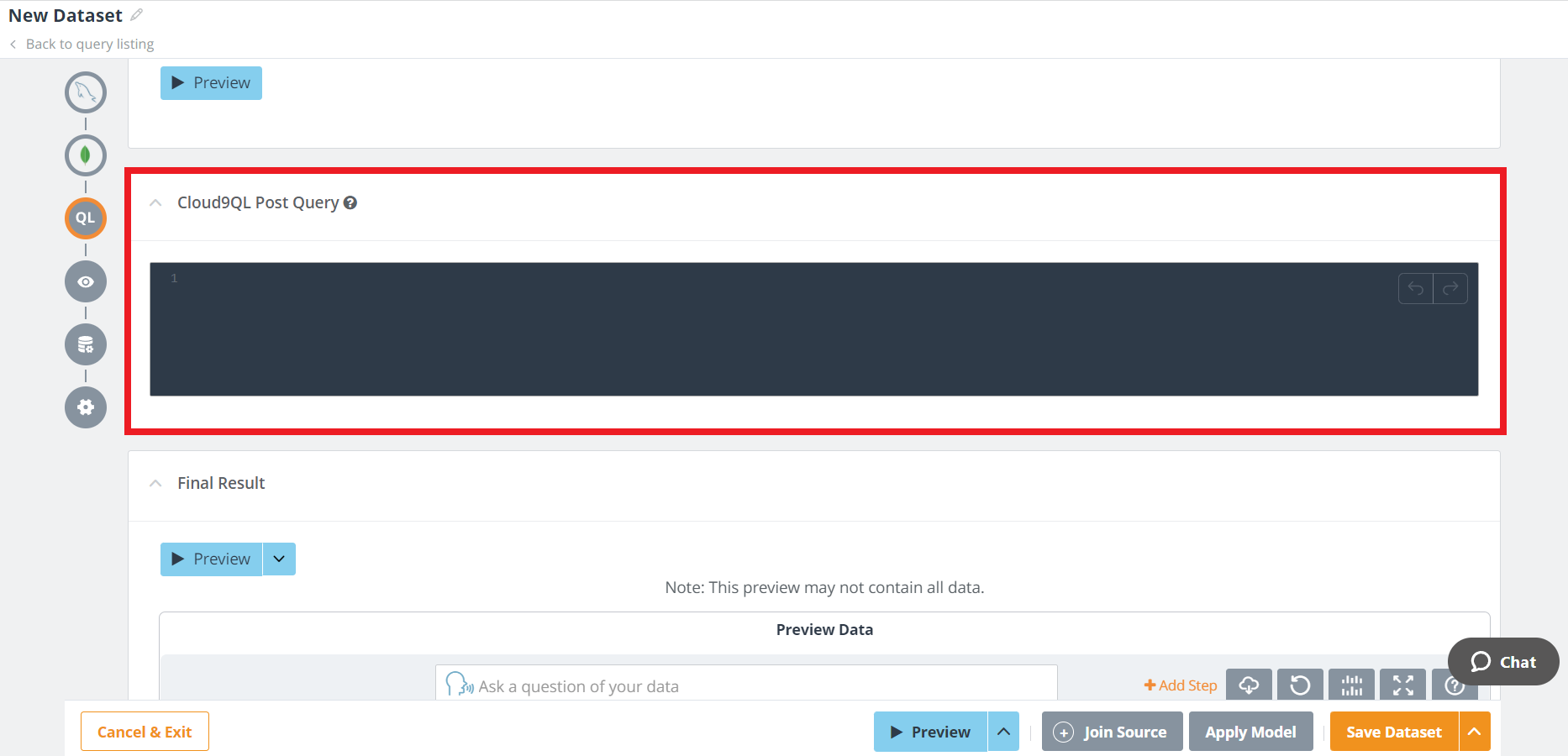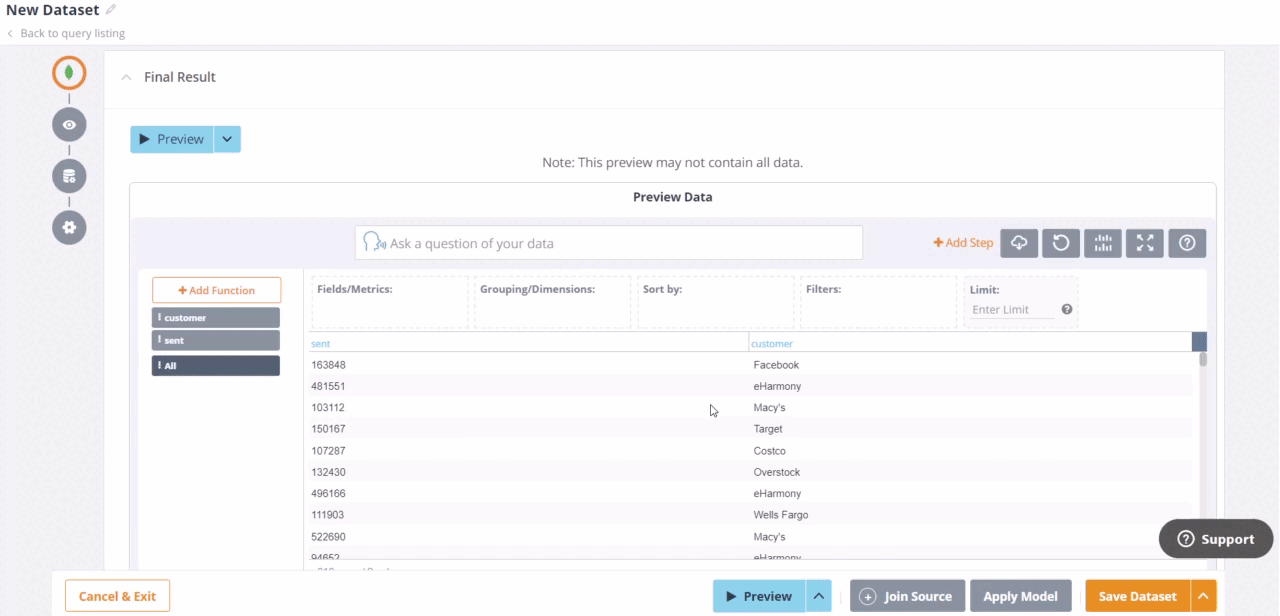 Data Manipulation after Joins: You can modify/transform the data returned in powerful ways using Cloud9QL at the bottom of the page. This section can be used to apply a Cloud9QL query as the very last step of processing. Alternatively, you can also interact with the grid directly for any manipulations of the data.