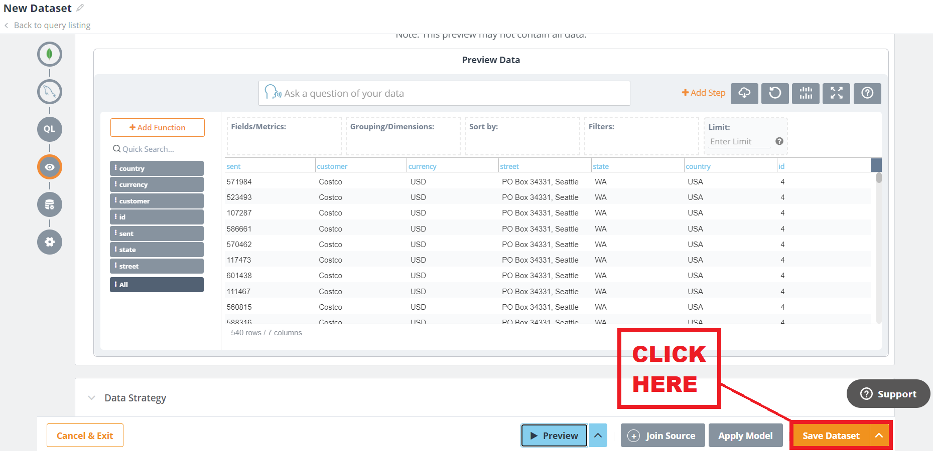 The preview should now contain data from both MongoDB and MySQL that includes address and currency fields added to the MongoDB query for those customers.