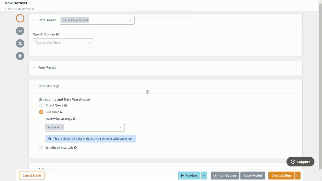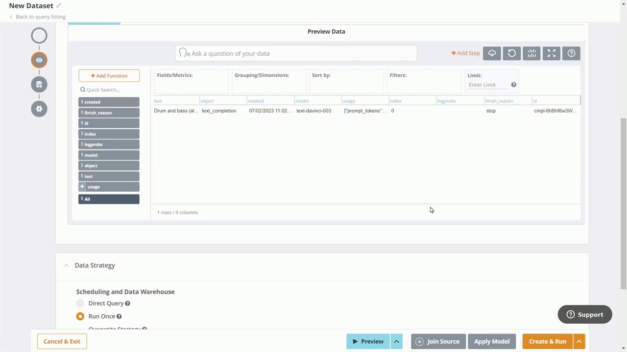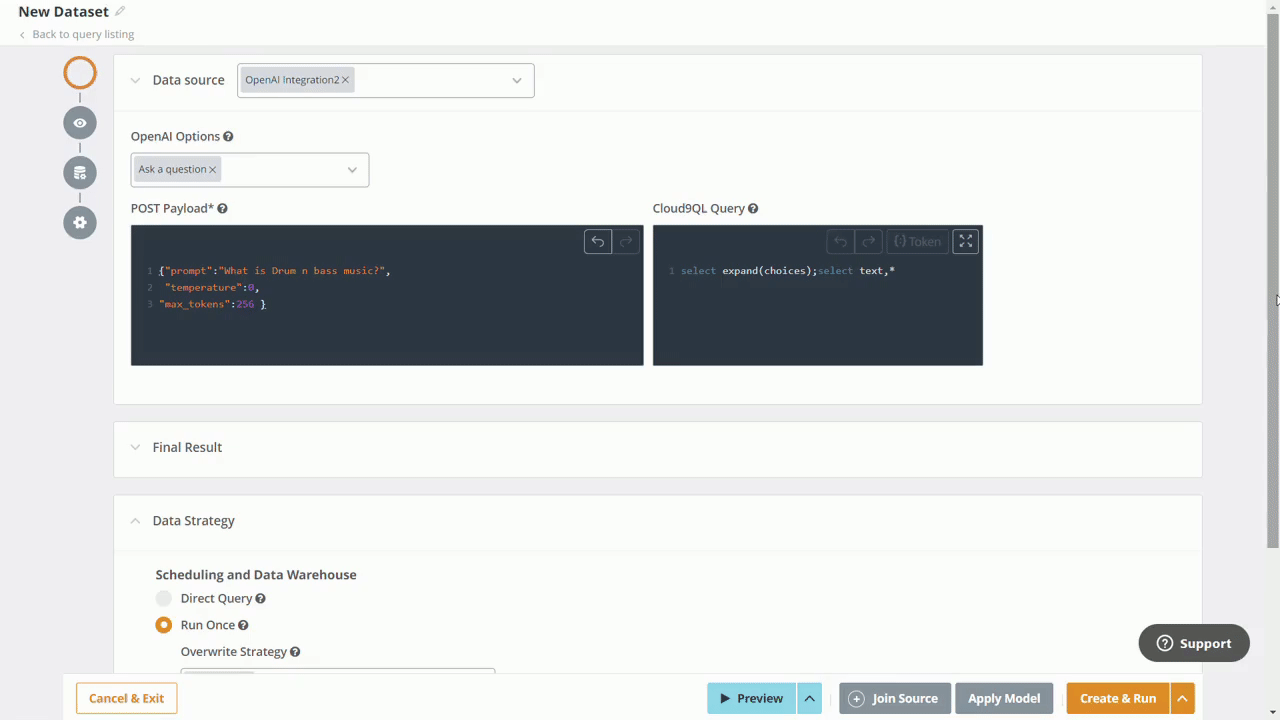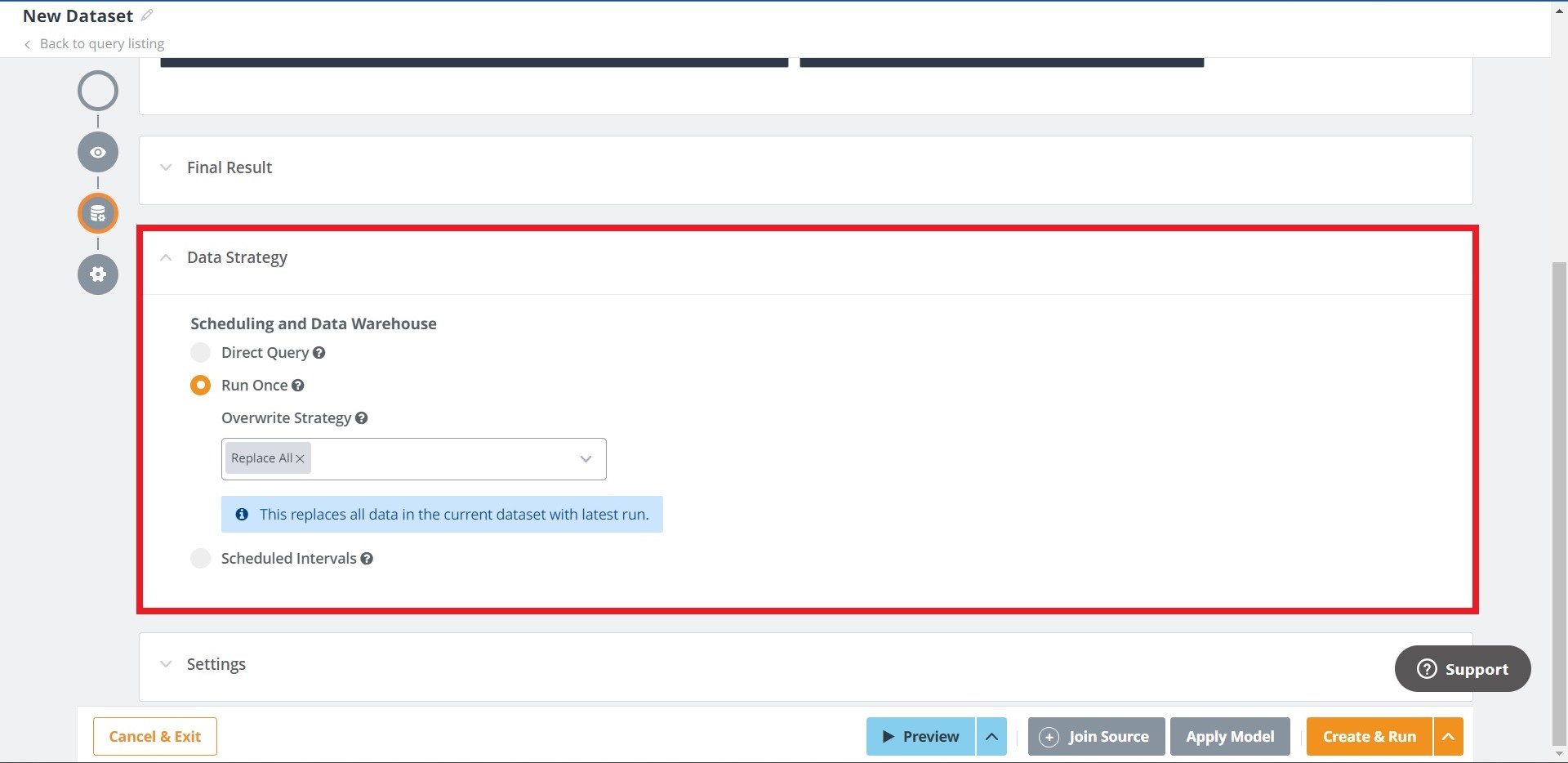 The result of your Query is called Dataset. After reviewing the results, name your dataset and then hit the Create & Run button.