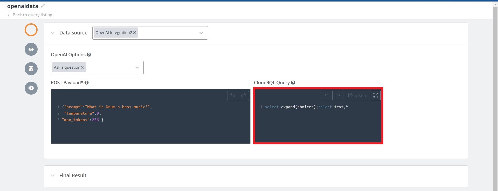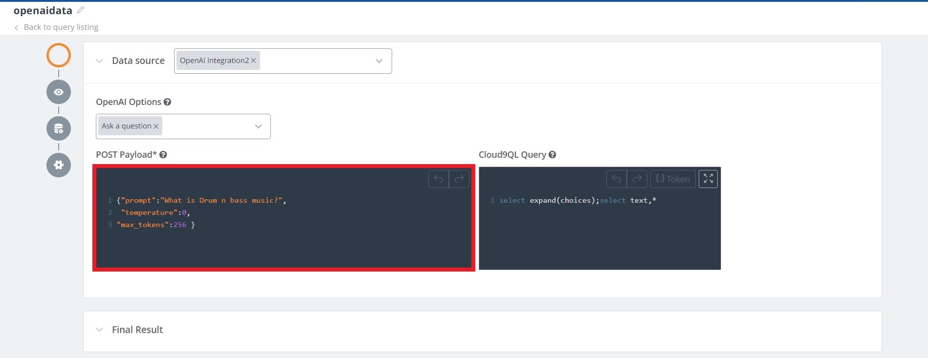 Step 1: After connecting to the OpenAI datasource, Knowi will pull out a list of options, using which you can build queries using Post Payload and Cloud9QL Query.