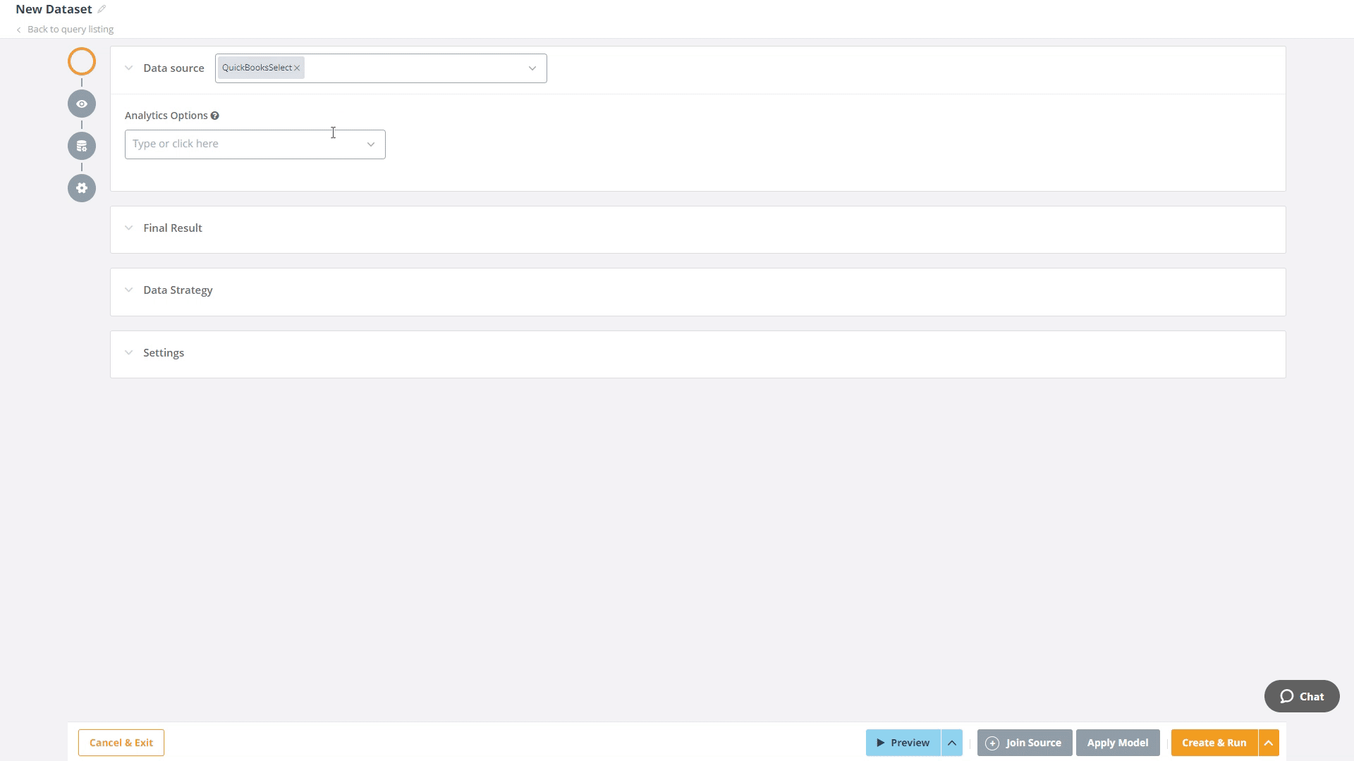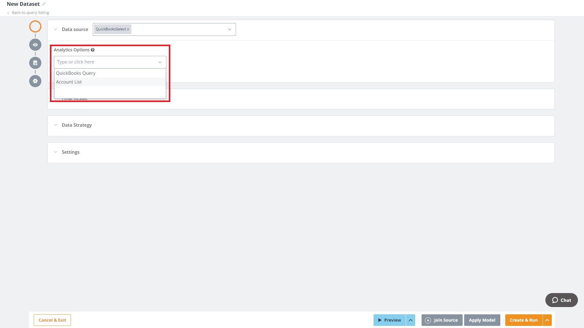 Click on the "New Datasource +" button and select QuickBooks from the list of datasources.