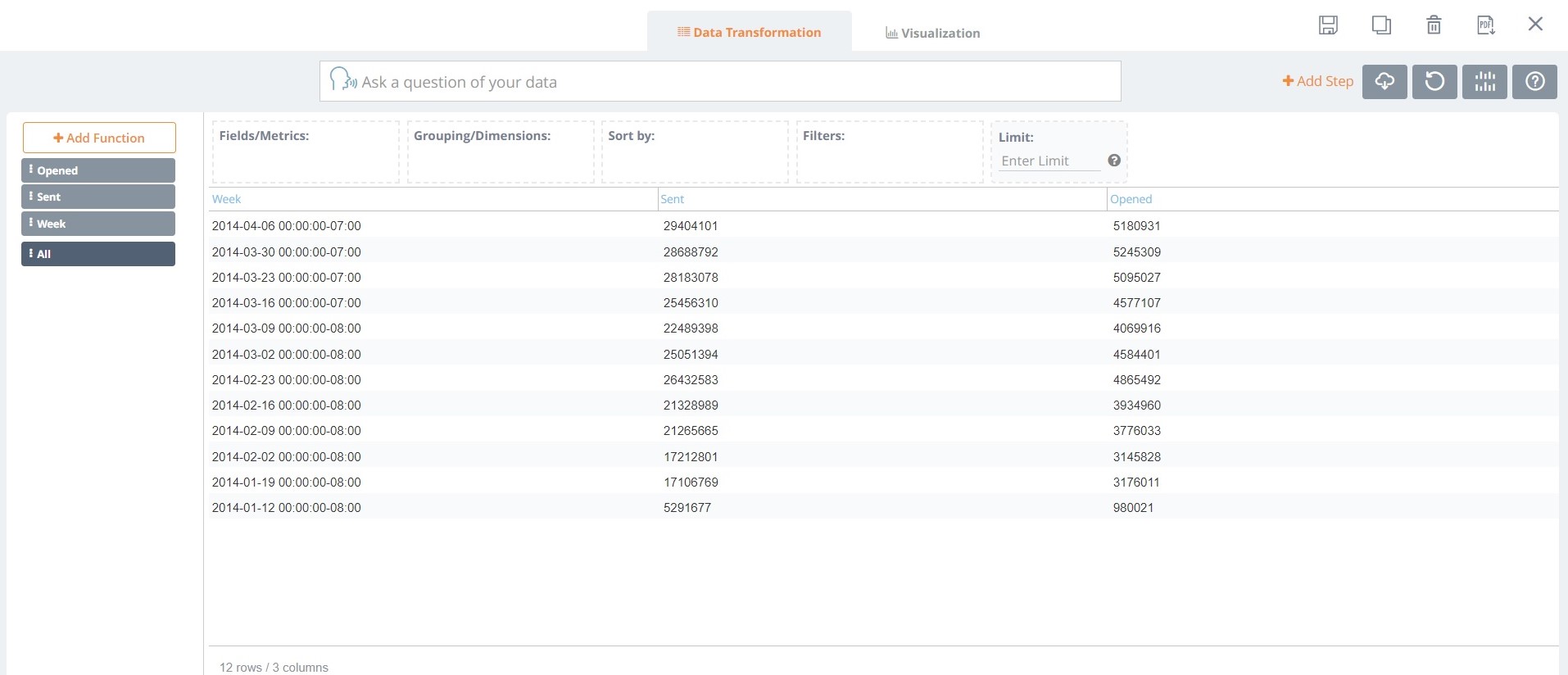 Add Step button leverages the power of being able to perform sequential Cloud9QL operations upon the grid. For example, transforming data and then aggregating would be a 2 step process.