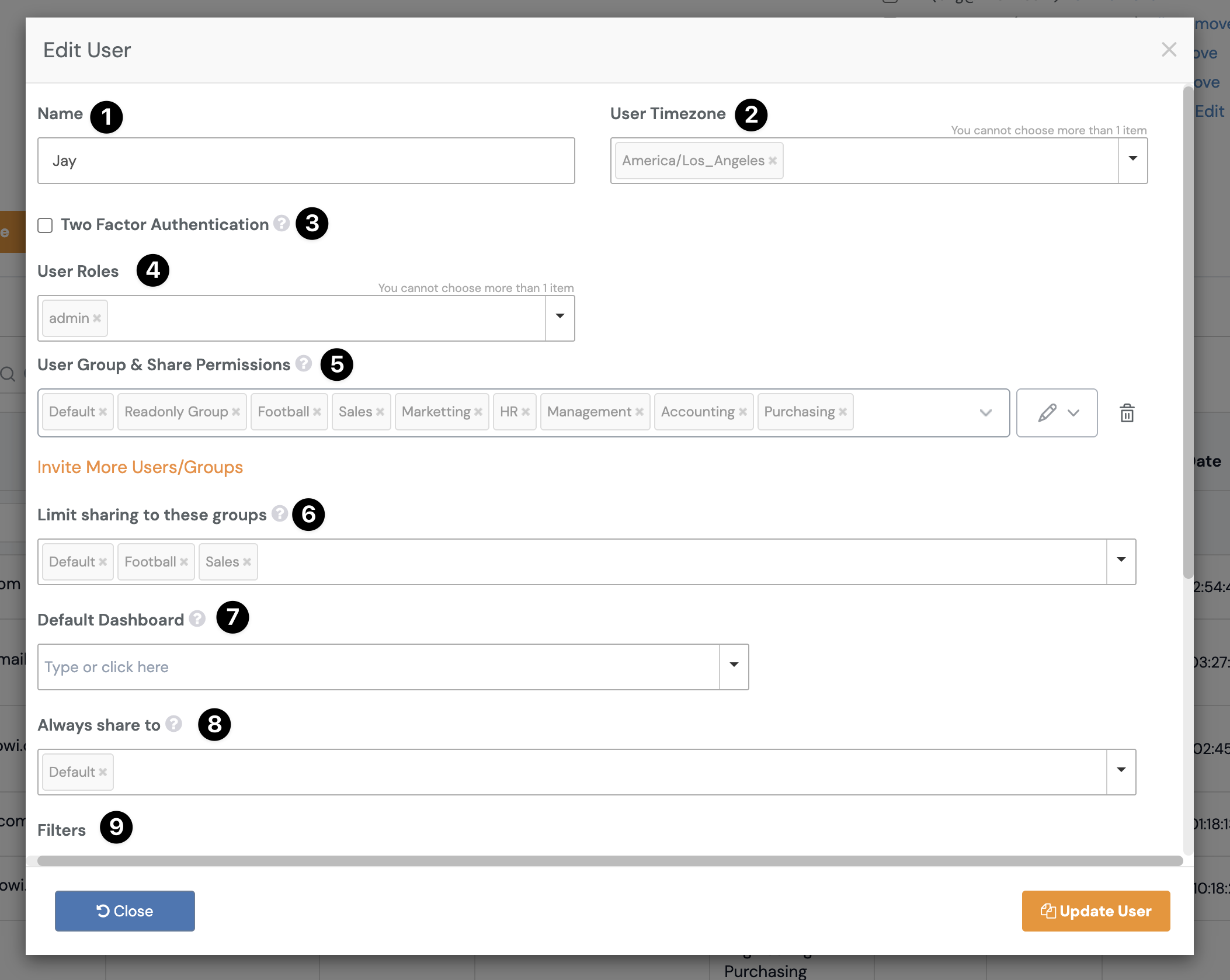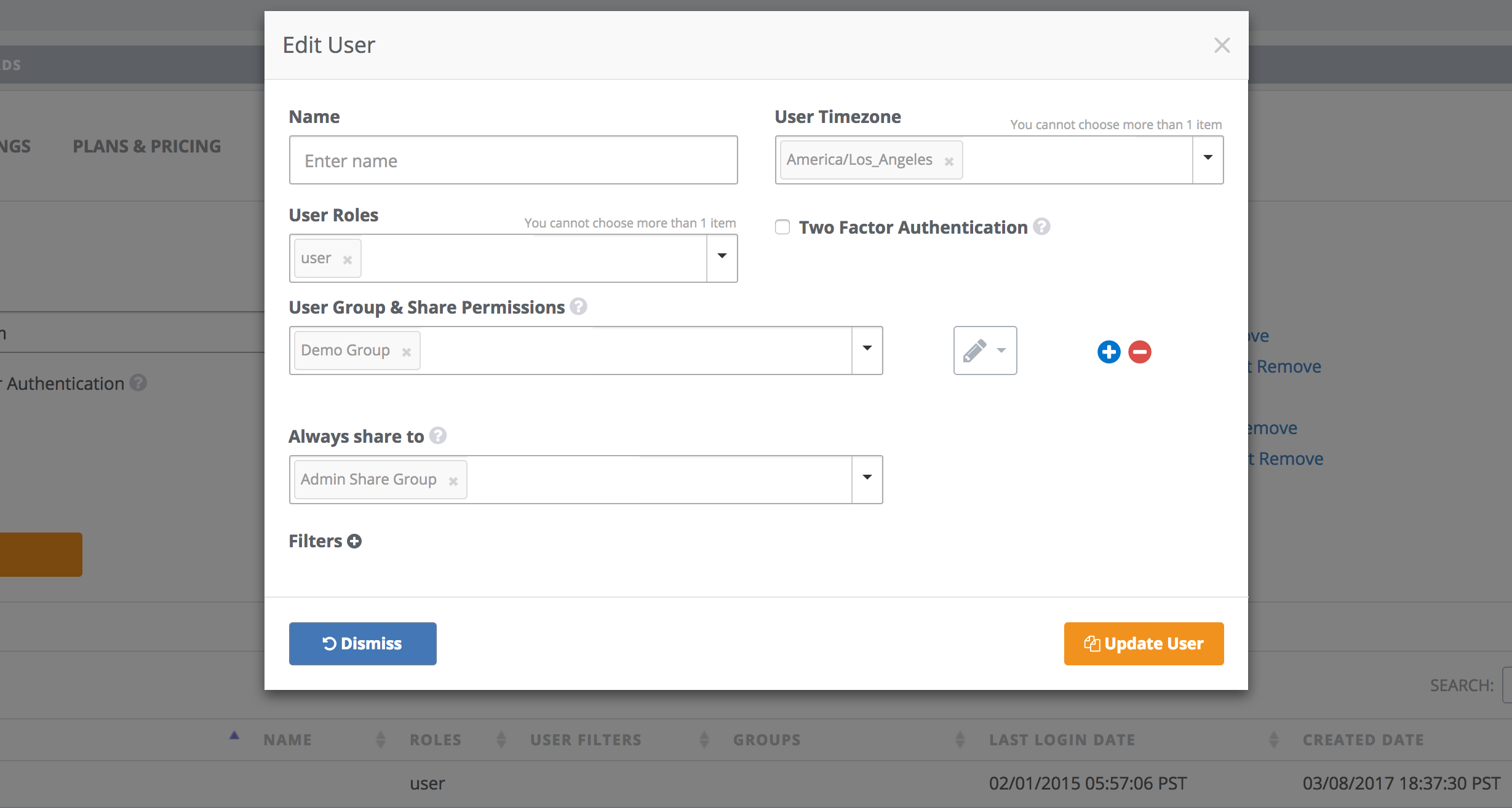 There may be cases when any asset that the user creates needs be automatically shared to other groups, instead of sharing a specific asset explicitly (query etc.). In such cases, you can apply an 'Automatic Share to Group' setting that will automatically publish any assets created by the user to those groups that can be used by other users. This is available during user creation as well as within the edit menu.