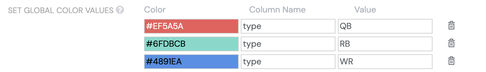 SET GLOBAL COLOR VALUES: Set default colors for specific values in a column. These colors will apply to all visualizations where the column name matches. In the example below, any chart that uses "type" as the grouping field will automatically assign those colors to the matching values. Column names and values are not case sensitive. If widget-level color settings are applied, they will override the global colors.