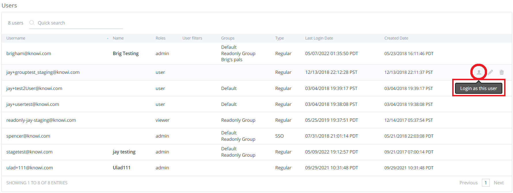 You can merge or transfer a user between authentication types (Knowi email/password, LDAP, SAML, SSO). This can be done using the Management API or from the UI.