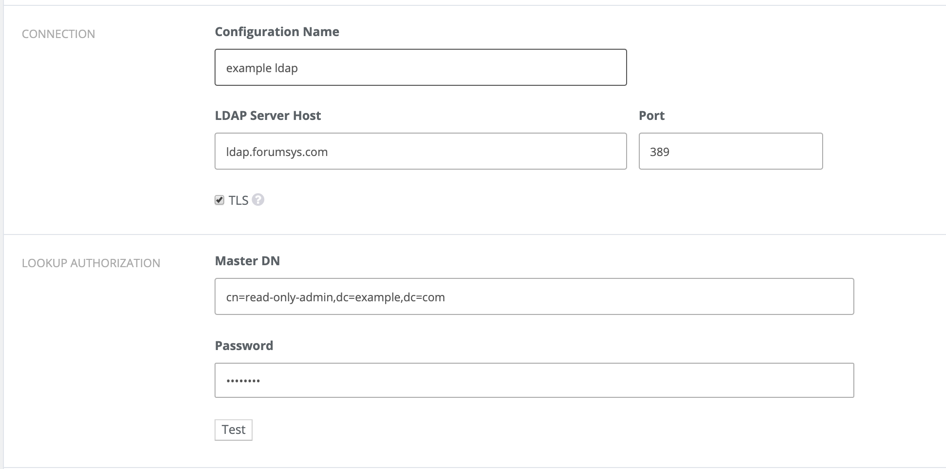 This section used to enter an "master" LDAP account which have access to get info about LDAP user objects which you or users want to login with. After entering credentials you can click small "Test" button to check if credentials and Connection details valid. This will run connection with LDAP server, "bind" with entered master DN and then unbind and disconnect from server.