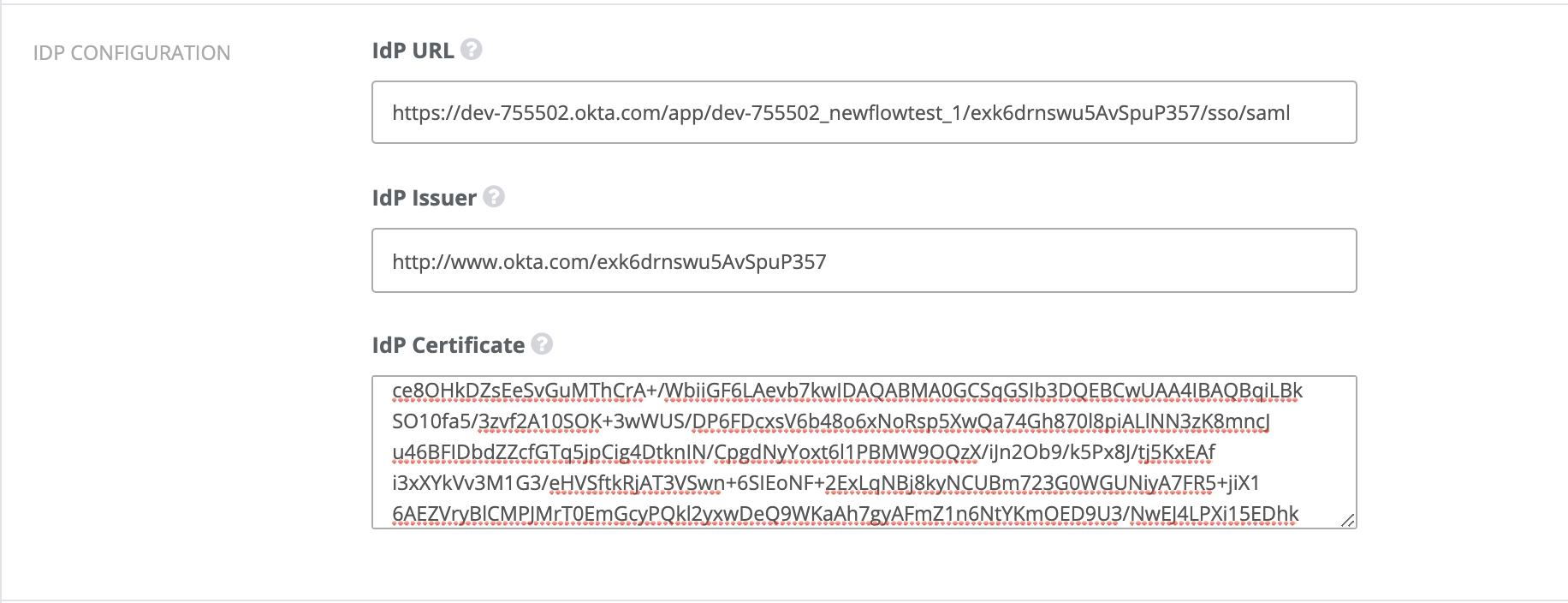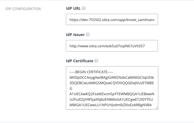 Knowi requires the IdP URL, IdP Issuer, and IdP Certificate to authenticate your IdP.