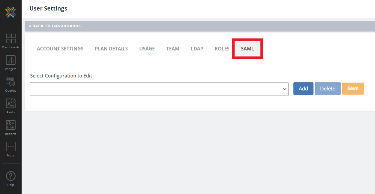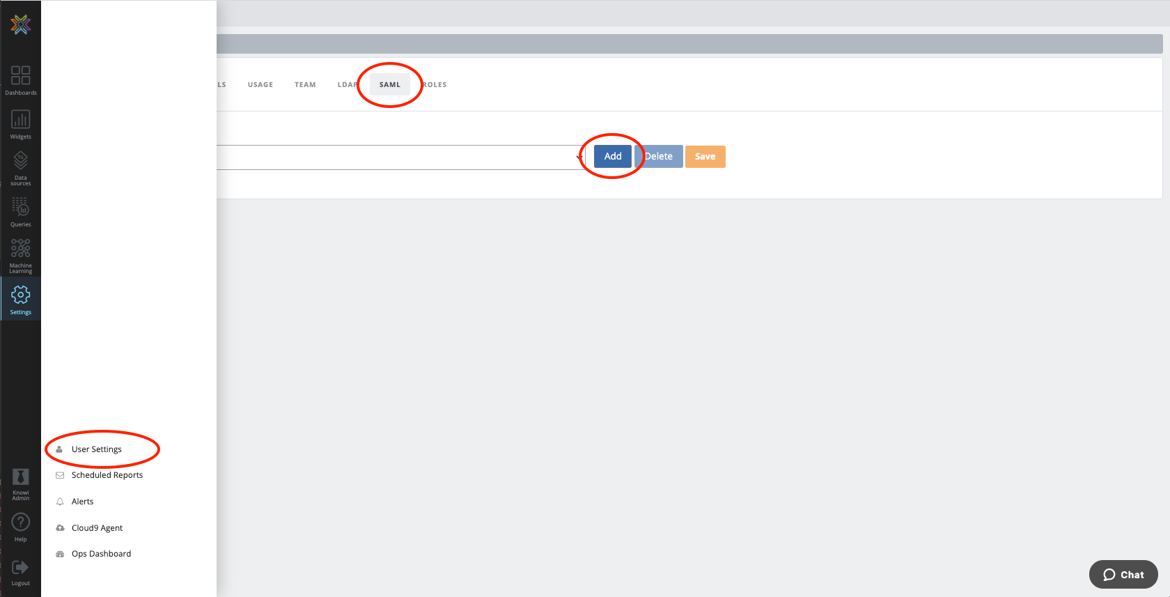 Go to your SAML tab by clicking on Settings in the left navigation bar then User settings. Click on SAML then Add. Keep this tab open, as you'll be returning to your Knowi Workspace later.