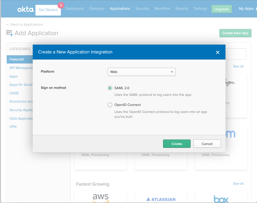Open up your Okta admin portal and set up a new application using the Applications tab. Select SAML 2.0 as your sign-on method. Configure your new integration by naming it Knowi and adding a logo if you want.
