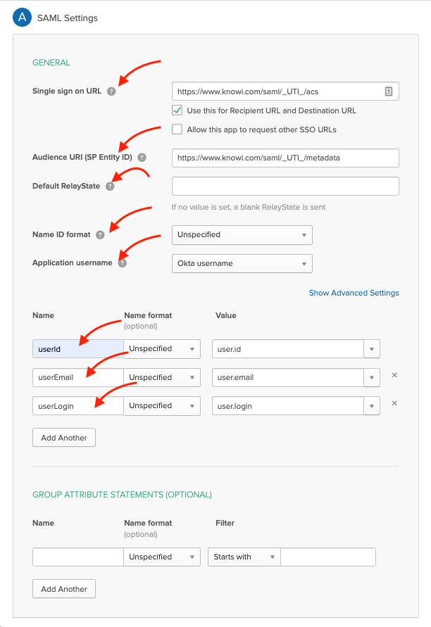 You'll now see Knowi's SAML Settings. Start with the General section below. You'll need to grab some information from Knowi and input it into Okta: