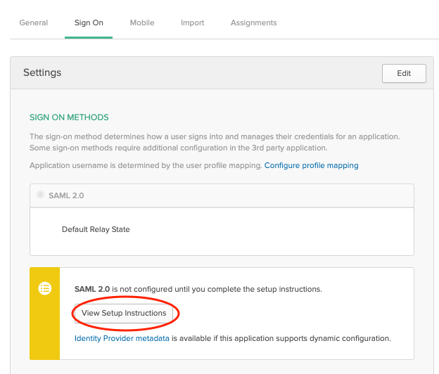 Your application is ready! You'll now need to take some information from Okta and bring it back to your Knowi portal. Start by clicking View Setup Instructions in your Sign-on Methods settings.