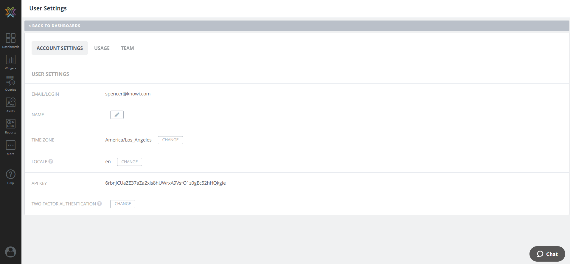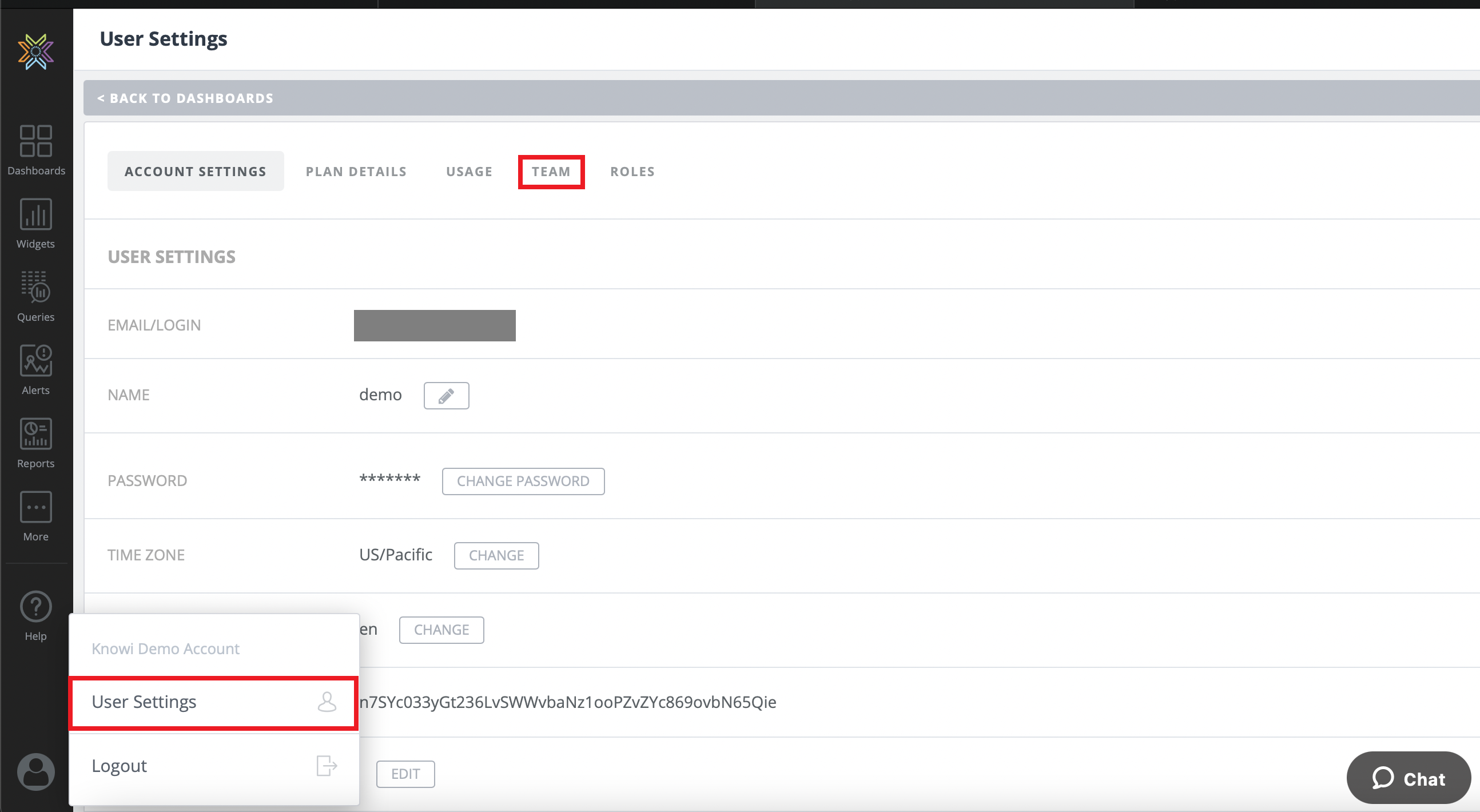 Navigate to the User Settings in Knowi to view, manage, or update their preferences for Account Settings, Plan Details, Usage, Team, Roles, and External Authentication from one central place.