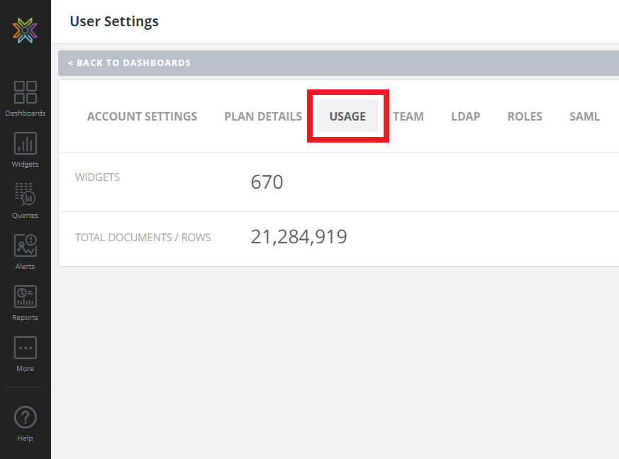 Navigate to the Usage tab to view the total number of widgets and rows running under the current account.