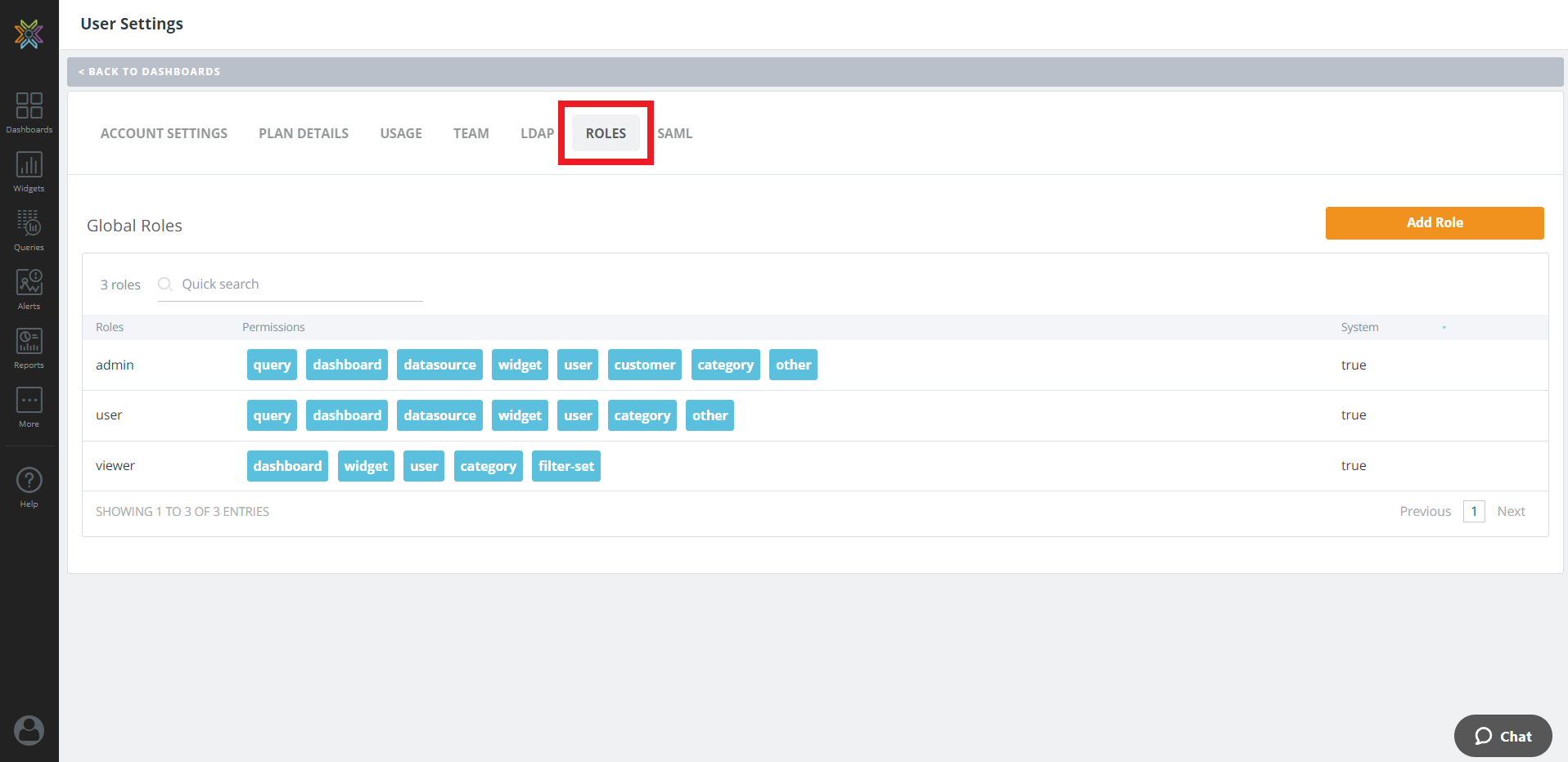 If the built-in roles don't meet the specific needs of your organization, you can add your own custom roles by navigating to the ROLES tab. Just like built-in roles, you can assign custom roles to users. See Custom Roles & Permissions for more information.