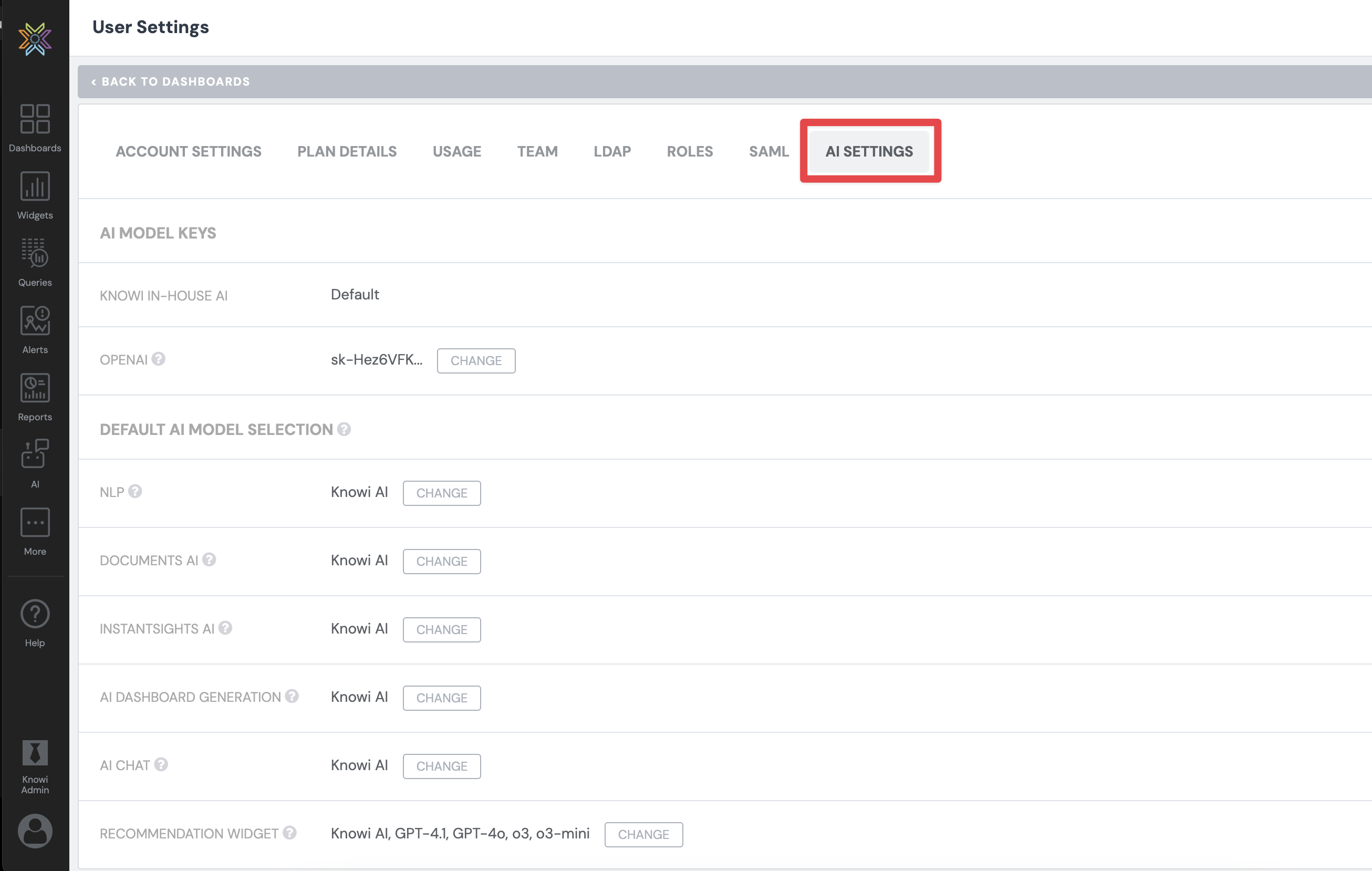 This section lets you control which models are available across different AI-powered features. By default, Knowi?s in-house AI is enabled for all features including NLP, Documents AI, InstantSights AI, AI Dashboard Generation, AI Chat, and the Recommendation Widget.