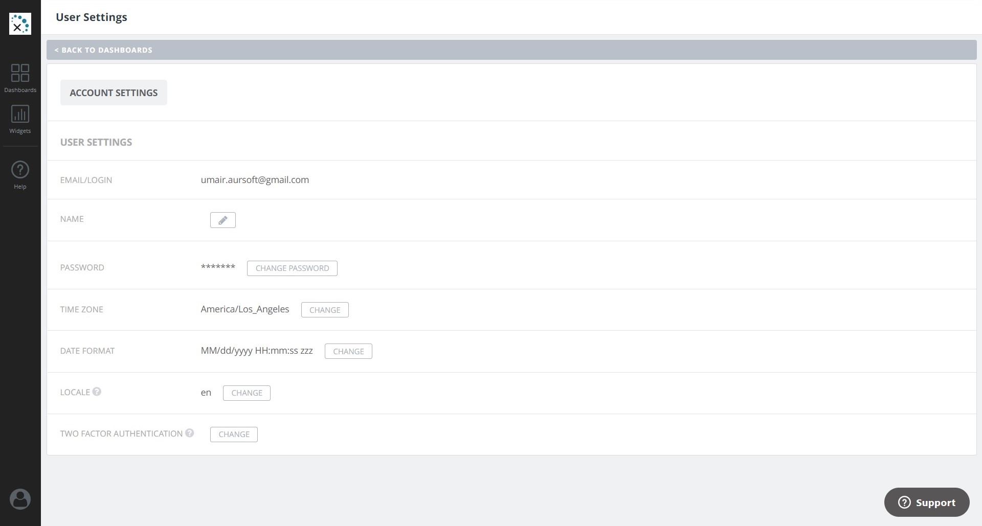 User settings can be found in the bottom left corner of the screen. From here, a user can change their password and their default timezone.