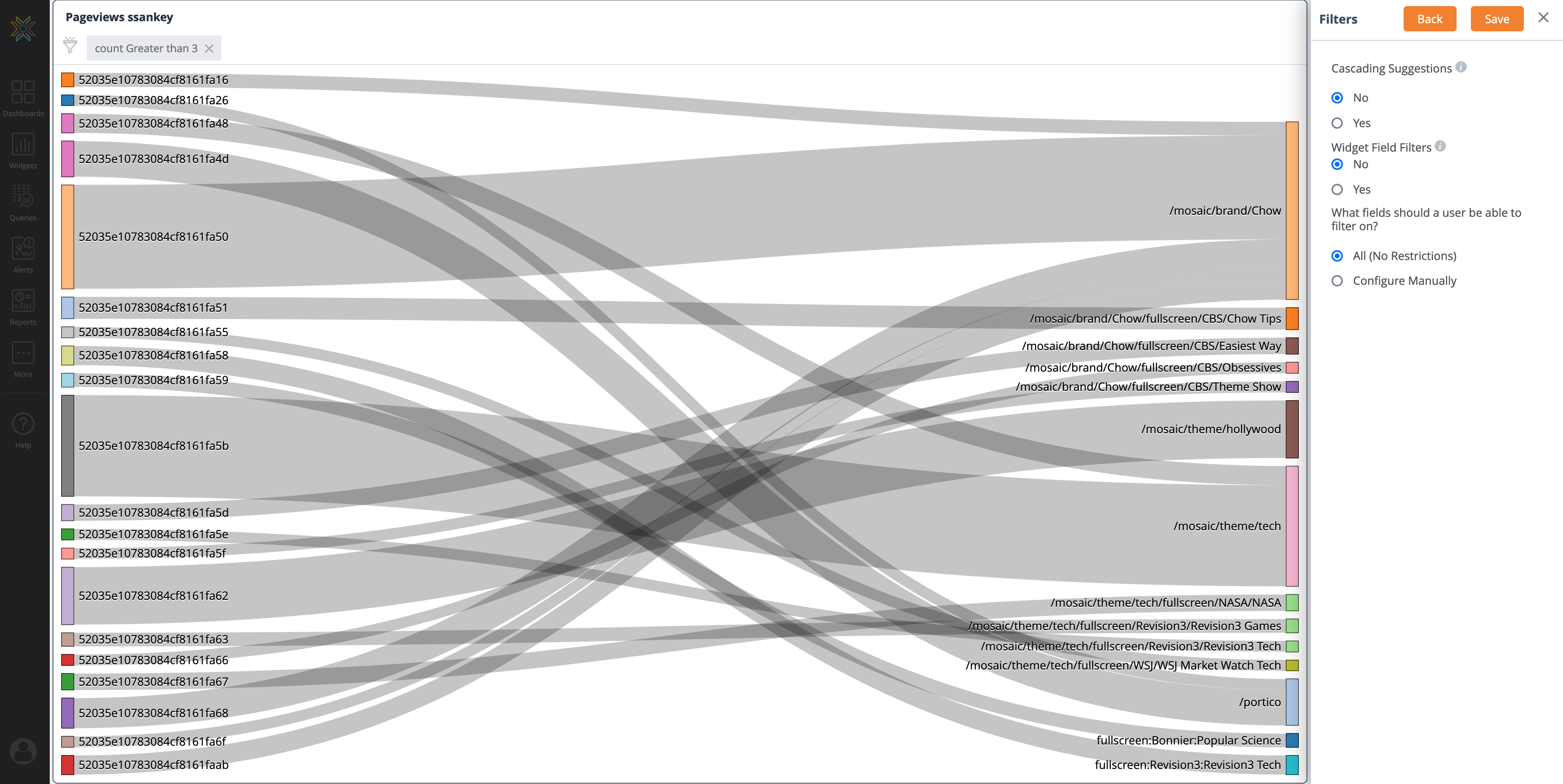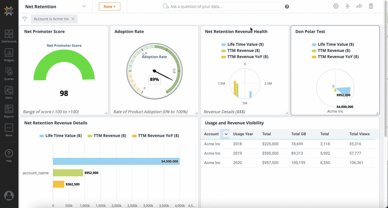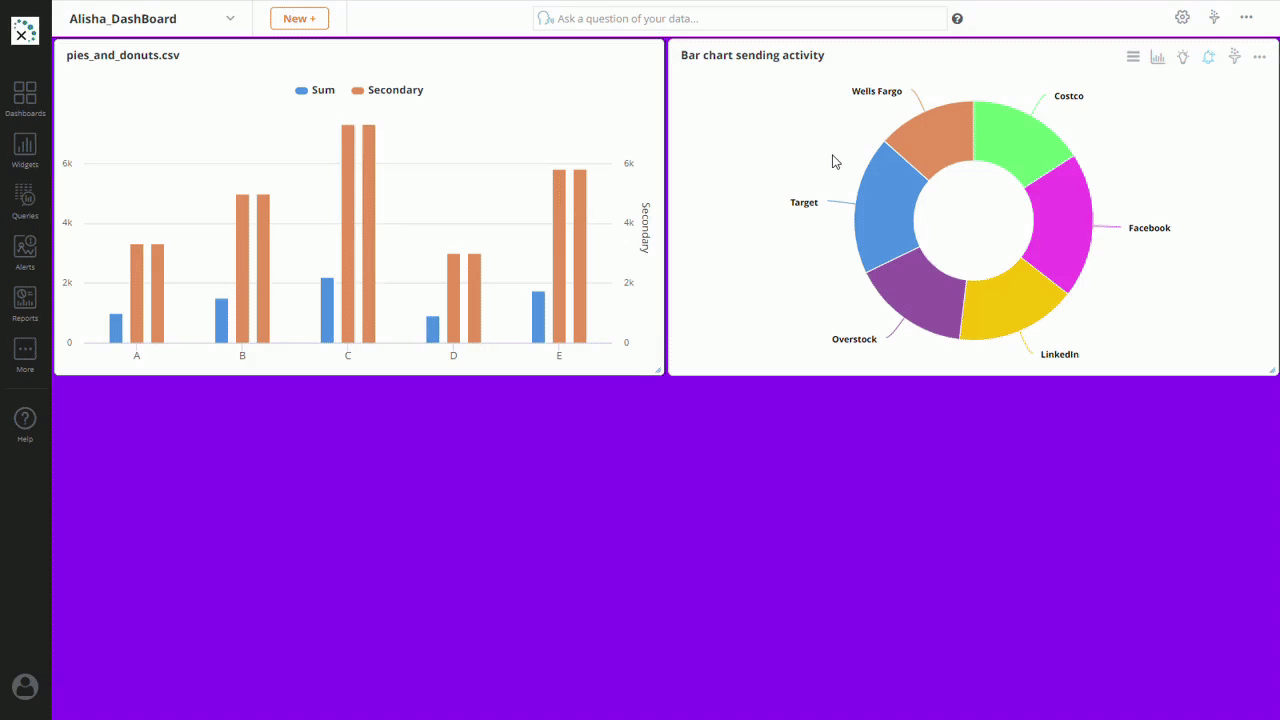A Widget is the visualization of a dataset. Visualizations help make sense of the dataset and draw actionable insights. One or more Widgets/Widget types can point to the same dataset.