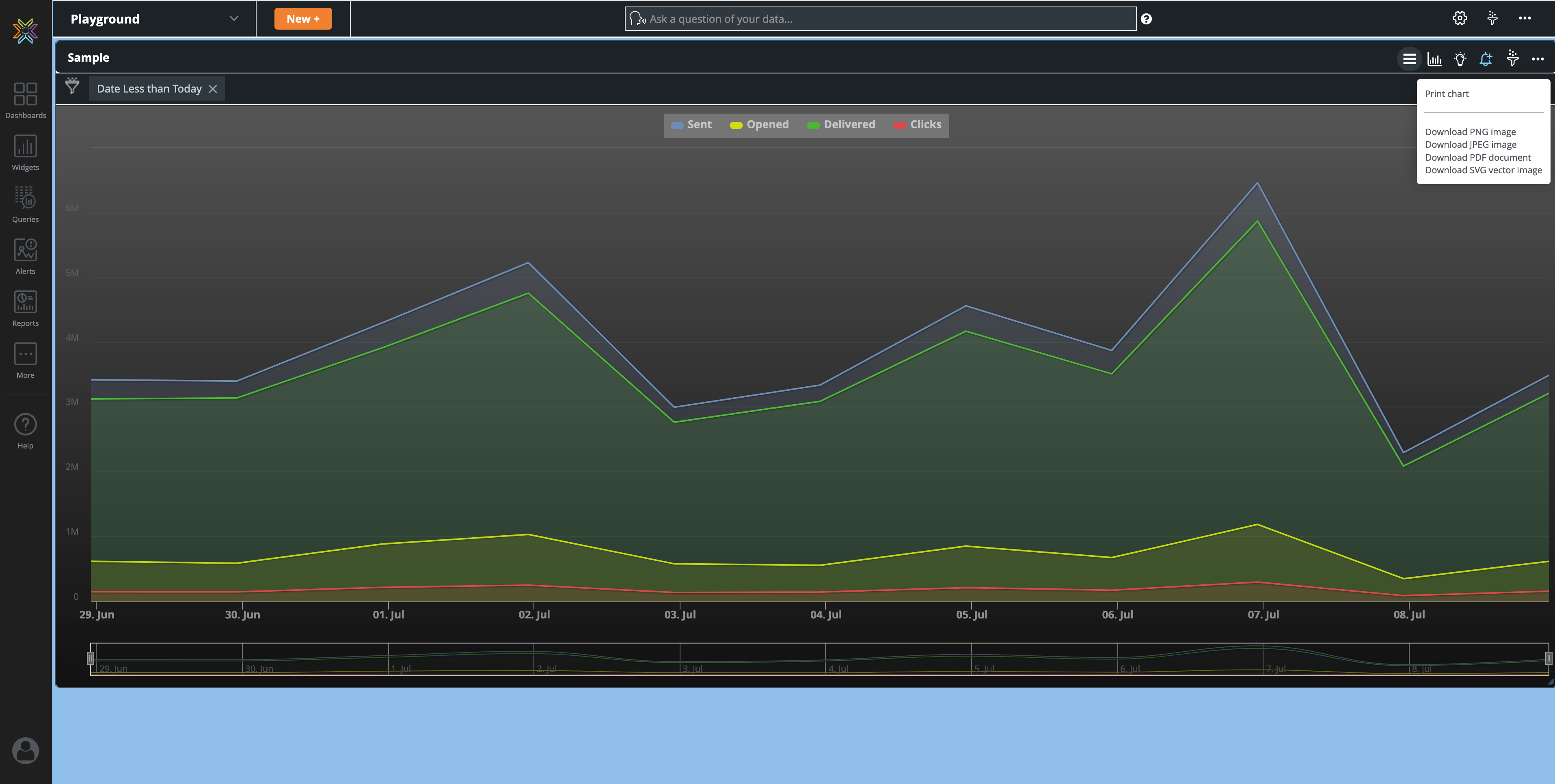 Downloading widgets is available only for widgets of type charts. For example, pie, area, or donut charts. The download formats are PNG, JPEG, PDF, and SVG vector. You can also print the chart using the Print Chart option.